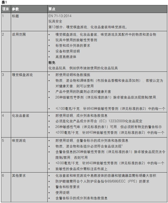 2014326日,CEN發(fā)布了一項全新的玩具安全標準EN71-13:2014,以規(guī)范嗅覺棋盤游戲、化妝品套裝,味覺游戲以及此類游戲或套裝的配件中所用物質(zhì)和混合物的要求。該標準同時還規(guī)定了玩具中禁用的致敏性芳香劑、標簽、成分列表、說明書、活動中將要使用的設(shè)備和高度易燃液體的使用等要求。