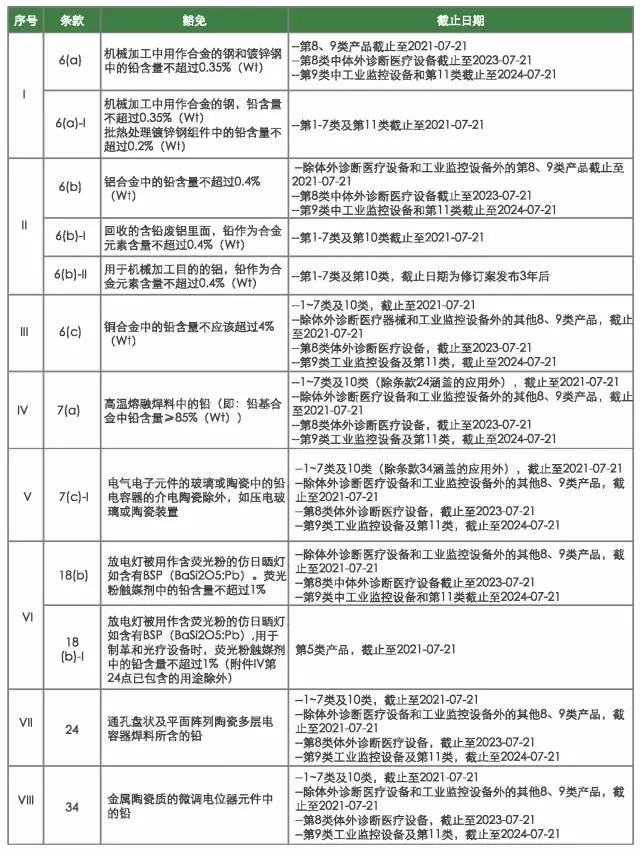 2017年9月19日,歐盟委員會(huì)就RoHS指令附件III中關(guān)于鉛的八項(xiàng)豁免提案發(fā)起了公眾咨詢,利益相關(guān)方可在2017年10月17日之前發(fā)表意見。